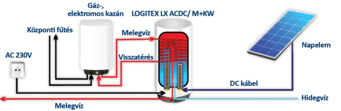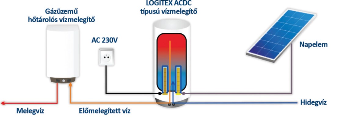 A víz előmelegítésére és melegítésére az LX ACDC típusú vízmelegítőket a víztartállyal felszerelt gázüzemű hőtárolós vízmelegítő és a hideg víz forrása közé kell telepíteni (1. ábra). Az ilyen bekötéssel és a LOGITEX márkájú vízmelegítők alkalmazásával három különböző forrás áll a rendelkezésünkre: gáz, villanyáram a fotovoltaikus panelekből és villanyáram a hálózatból (AC 230V).